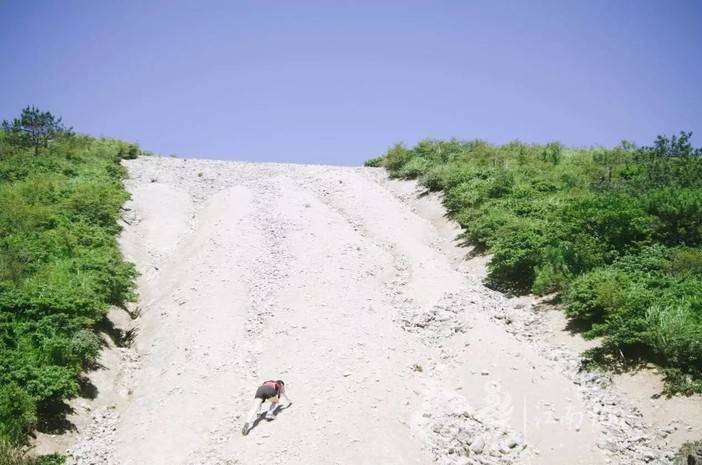 在不断爬坡的尽头是五岔路口,接着有几处反复的上坡和下坡,但爬升都不高,最后一段厉害了的防火道,有点,很不好走,见下图真人示范。